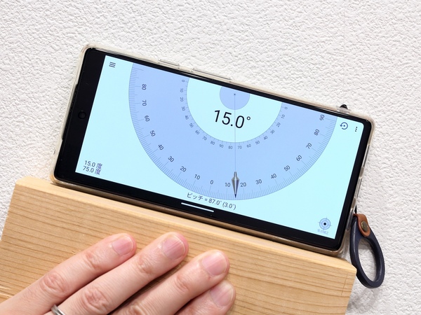 もう1つは、スマホの傾きを表示してくれるものです。例えば、丸のこの刃の角度を測るとか、壁に15度の角度で木材を固定したい、といった時に役立ちます。結構便利なのが、ゼロ点補正機能。このおかげで、基準面に対して正確な角度を測ることまでできます。