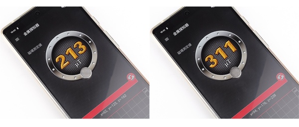 といっても、センサー付近に磁石を近づけてしまうと簡単に最大値を超えてしまうため測れません。そこで、そこそこいい感じの数値が出る場所を探し、そこに2つの磁石を交互に置いて比べてみました。
