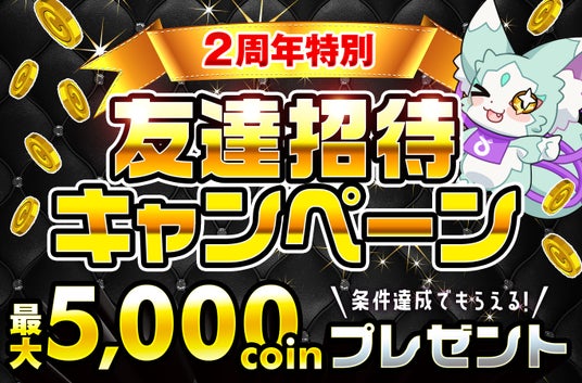 既存ユーザー様への感謝と、これから始める方への応援を兼ねて、2周年限定で、友達招待を行うと1,000ボーナスコインがもらえるキャンペーンを実施いたします。