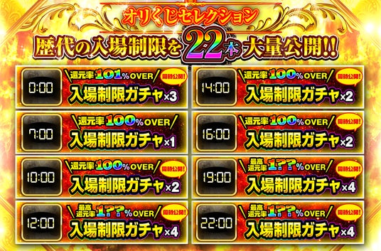 本企画では、還元率100%OVERのガチャが合計22個公開予定。公開に合わせて、リリーススケジュールもあわせて公開いたしますので、狙いのガチャが登場するタイミングを見逃さずにお楽しみいただけます。