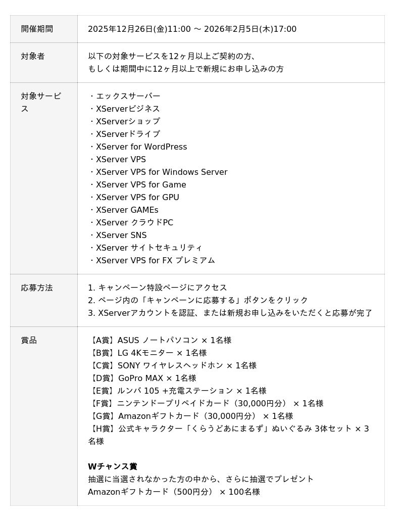 エックスサーバー株式会社(所在地:大阪市北区、代表取締役:小林 尚希)は、「Amazonギフトカード30,000円分」や「ASUS ノートPC」、「ニンテンドープリペイドカード」などの豪華賞品が抽選で当たる「新春!お年玉プレゼントキャンペーン2026」を開催します。