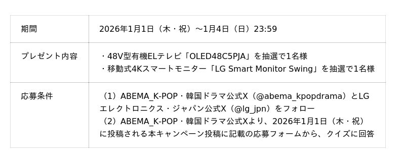 2026年1月1日(木・祝)から1月4日(日)の間、抽選でLGの48V型有機ELテレビ「OLED48C5PJA」または移動式4Kスマートモニター「LG Smart Monitor Swing」が当たるXプレゼントキャンペーンを実施します。