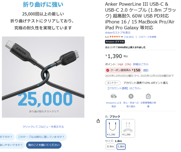 年末はスマホもPCも“充電渋滞”しがち。出先や自宅で「あと少し長ければ…」となりやすいのがUSB-Cケーブルです。今回は、Ankerの定番「PowerLine III USB-C & USB-C 2.0 ケーブル(1.8m)」が、期間限定のクーポンでさらに手に取りやすくなっていたのでチェックしました。60WのUSB PD対応で、スマホからノートPCまで1本でまかなえる“常備ケーブル”候補です。