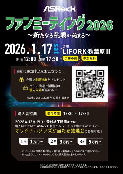 ASRockが主催する「ASRockファンミーティング2026」が、1月17日に東京・秋葉原のLIFORK秋葉原 IIで開催される。CES2026で展示される新製品を国内でいち早く披露するこのイベントには、予約不要で誰でも自由に参加することができるという。事前に専用フォームから参加申し込みを行うと記念品が贈られる特典も用意されている。