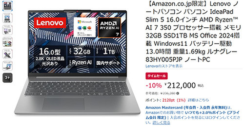 Ryzen AI搭載×OLED 16型。Amazon限定モデル「Lenovo IdeaPad Slim 5」がセール中!