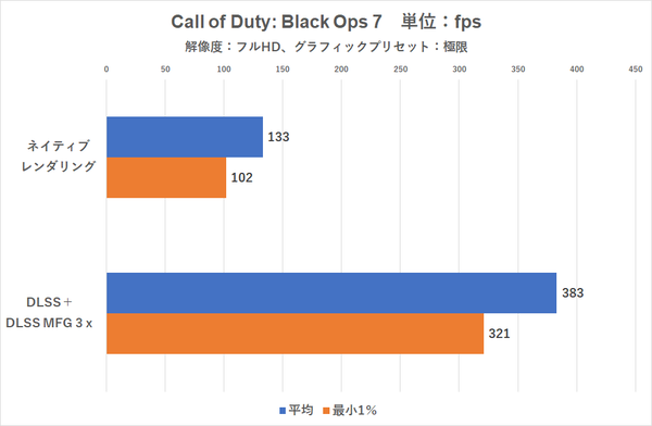 まずはCoD: BO7の検証から。対戦FPSの定番「Call of Duty」シリーズの最新作で、前作「Call of Duty:Black Ops 6」に続く近未来が舞台となっている。グラフィックのプリセットは「極限」(最高設定)にして、ゲーム内のベンチマークでネイティブレンダリングとDLSS適用のフレームレートを検証した。