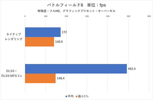 ネイティブレンダリングでも平均172fps、最小140fpsと良好な結果だった。これならアップスケーリングに頼る必要はないだろう。ちなみに、マルチフレーム生成を使えば平均フレームレートは492fpsまで伸びたが、最低フレームレートは伸び悩んだ。フレーム生成も万能ではない印象を受けた。