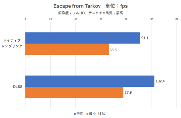 タルコフはさすがに重いもののDLSS適用で平均102fps