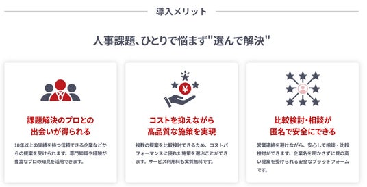 比較検討まで完全無料で利用できる点や、提案段階では企業名を開示しない匿名設計を採用している点を特徴とし、企業が心理的な負担なく組織課題の解決策を検討できる環境づくりを目指しています。