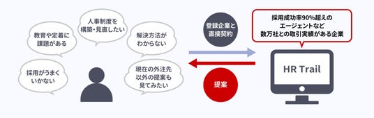 HRTrailは、企業が抱える人事・組織課題に対して、実績ある複数の人事プロフェッショナル企業から解決提案を受け取り、それらを比較検討できる人事支援プラットフォームです。