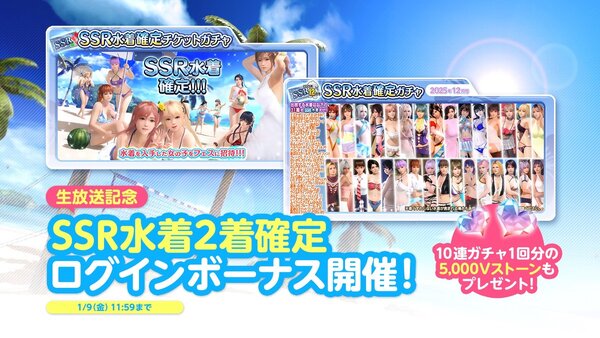 公式生放送報酬として、「SSR確定ガチャチケット(2025年12月号)」「SSR確定ガチャチケット」「無償Vストーン×5000個」を受け取れる期間限定ログインボーナスを開催。