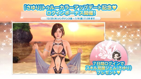 期間限定ログインボーナスを開催。7日間ログインすると「ヴィーナスギフト」を最大20個、「スキル覚醒ジェム(さゆり)」と「SSR確定ウィークリーガチャチケット」を最大1個ずつ入手できる。