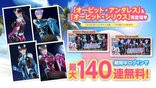 過去に登場した10人の女の子のSSR水着「オービット・アンタレス」「オービット・シリウス」が2種類のガチャで登場。開催期間は、2026年1月9日11時59分まで。
