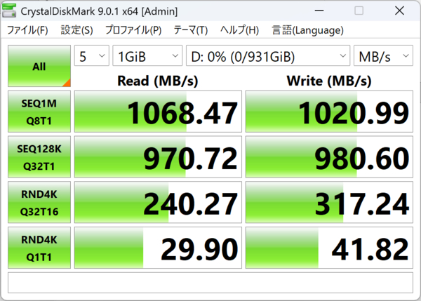 「CrystalDiskMark 9.0.1」で計測した結果。しっかり公称値を叩き出している。計測したマシンは、USB4端子を装備し、インテル Core i7-11375Hプロセッサーを搭載した「VAIO Z」を使用