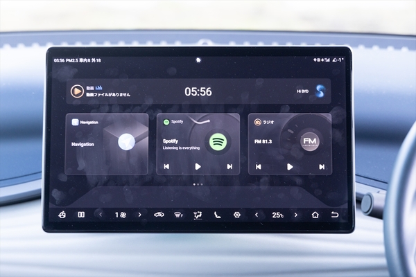 一方、中央のタッチスクリーンは15.6インチとかなり大型。ちなみに日本導入当初は12.8インチでした。文字も大きく、これは使いやすいと思う反面、エアコンを操作しようとするとナビが見えないのはちょっと不親切かなとも。ここらへんは最近のクルマあるあるなので、BYDに限らずエアコンなどは物理ボタンを残してほしいですね。