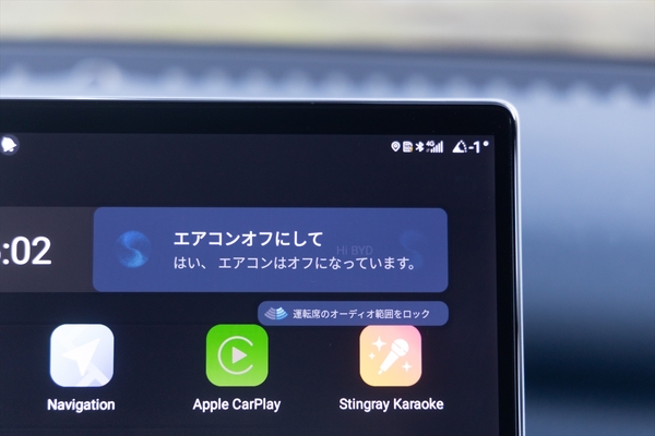 驚いたのは音声アシスタントが用意されていること。「ハイ! BYD」で起動し、住所やエアコンの操作ができます。しかも、日本語にもキチンと対応しているため、使い勝手は良好。