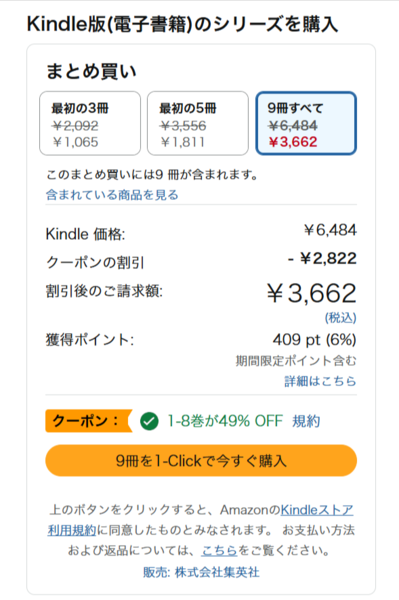 3662円 (定価6480円)+ポイント還元 409 pt (第9巻のみ48%分)