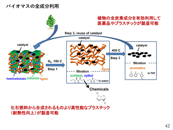 残る成分のリグニンは、例えば製紙産業などではセルロースだけを取り出し、残ったリグニンは燃料として燃やされてしまい、材料としては使われてこなかった。山口氏の研究ではこのリグニンをさらに高温条件で処理して分解し、プラスチック原料として利用可能な構造化合物へと変換する。これらの反応に用いる固体触媒が繰り返し使用できる点も大きな特徴だ。