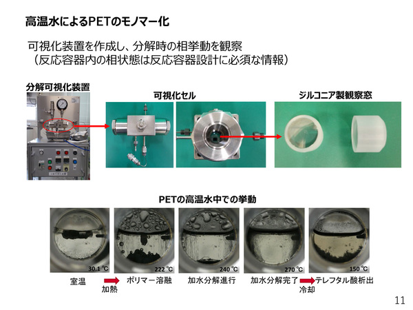 ケミカルリサイクルでは、圧力をかけて300度程度に高めた高温高圧の水を用いてペットボトルのPETを10分ほど処理することで、PETが原料であるモノマーまで戻るので、再度重合してプラスチックにすることができる。マテリアルリサイクルでは、ポリエチレンを溶かして固め、プラスチックとして再利用できるようになるが不純物が入ってしまうため繰り返すことで劣化するのが難点だ。