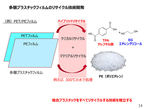 もう一つの研究テーマであるプラスチックリサイクルは、特に複合フィルムに焦点を当てている。食品包装材などに使われる、PET(ポリエチレンテレフタレート)とポリエチレンなどの複数素材を貼り合わせたプラスチックはほとんどリサイクルされずに燃やされているが、山口氏は水だけで処理し、PETはケミカルリサイクル、ポリエチレンはマテリアルリサイクルにする「ハイブリッドリサイクル」という技術を開発している。