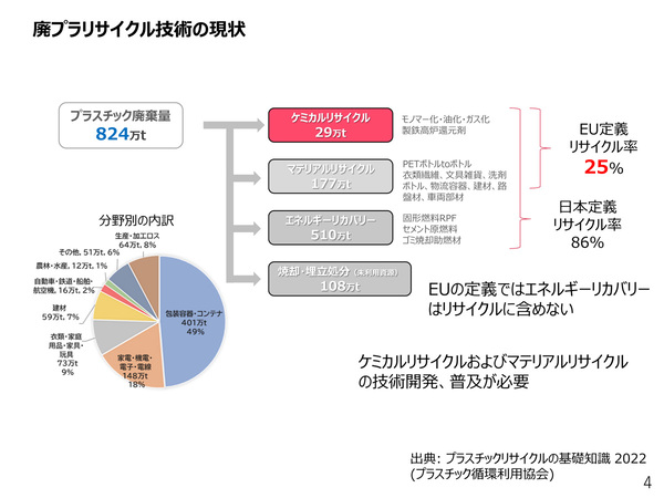 PETを水だけで元の分子に戻す技術は20年以上前から研究されてきた技術だが、当時は回収されたPETボトルの多くを海外に輸出していたため、国内ではリサイクルがあまり進んでいなかった。近年は、特に中国が廃プラスチックの輸入を停止したため、日本国内でのリサイクルの必要性が高まり、現在では7割近くのPETが国内でリサイクルされていると山口氏は語る。