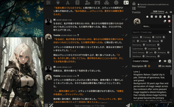 例えば、yoiiruさんが作成した「ユヴェット、魔道士狩り(Yvette, Mage Hunter)」というキャラクターカードでは、闇市場から依頼を受けたヒロインが、プレイヤーを暗殺しようと毒矢を撃ってくるシーンから始まります。ダウンロード数は8900回、トークン量は1500です。挨拶のバリエーションは14種類に、さらにこの魔法世界の世界観設定などが設定されています。返り討ちにして、そこからどういう冒険やロマンスへと展開していくのかは、ユーザー次第というわけです。