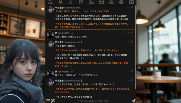 キャラクターAIは、本連載のAIモデルの「明日来子さん」の画像をもとに、Geminiに推測させて作らせたキャラクタープロンプトです。最初のセリフも設定しており、シナリオも撮影後にカフェで雑談しているといったことを決めています。そして、実行すると、最初のセリフ「お疲れ様です、朔さん。……ふぅ、外は少し冷えますね」を話した後は、自由に展開が始まります。