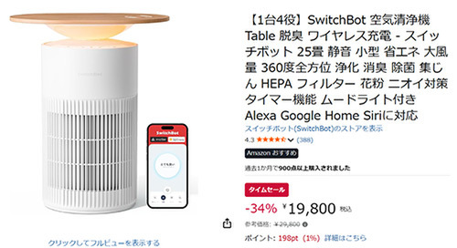 スマートホームブランドSwitchBot(スイッチボット)の空気清浄機「Table」が、Amazonタイムセールに登場しました。参考価格29,800円のところ、34%オフの19,800円で販売中です。