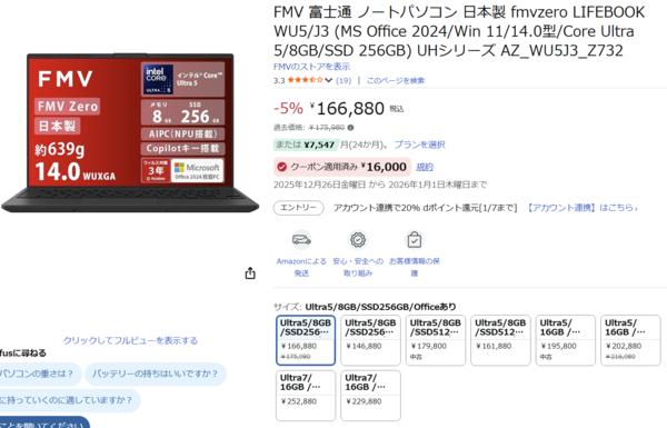 Amazon.co.jpにて富士通の「FMV Zero LIFEBOOK WU5/J3」は、過去価格(175,980円)からの値下げ表示に加えて、クーポン適用で実質価格が動くタイプ。見た目の表示価格と最終価格がズレやすいので、購入直前に「クーポン適用済み」になっているかを確認しておくのがコツです。