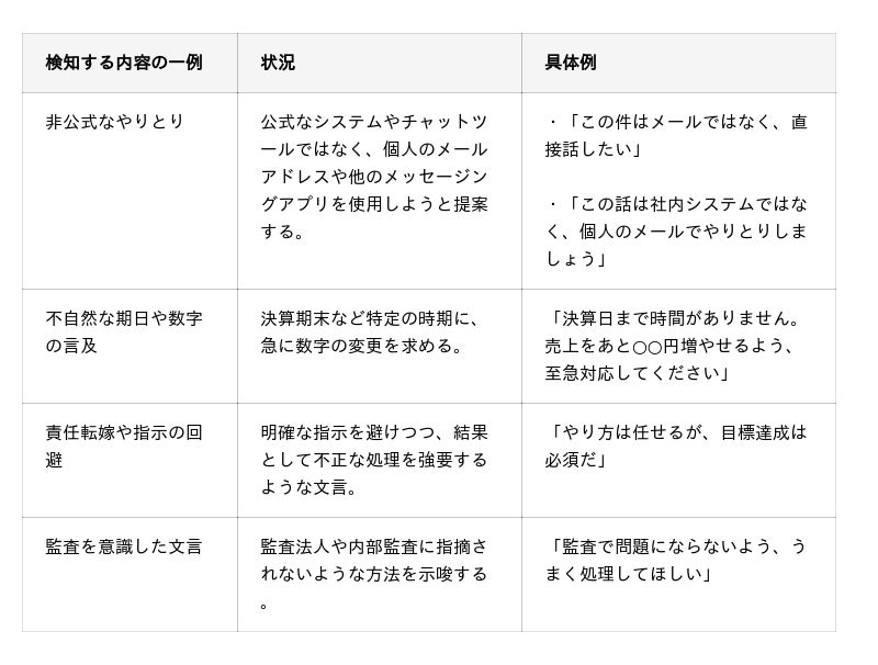 単なるNGワード検知にとどまらず、GmailやSlack、OutlookやTeamsなどのメールやチャットの文脈から、リスクを判定します。たとえば、以下のような内容の場合、不正会計リスクやハラスメントリスクのスコアリング数値が高くなり、人事やコンプライアンス部門へ通知します。