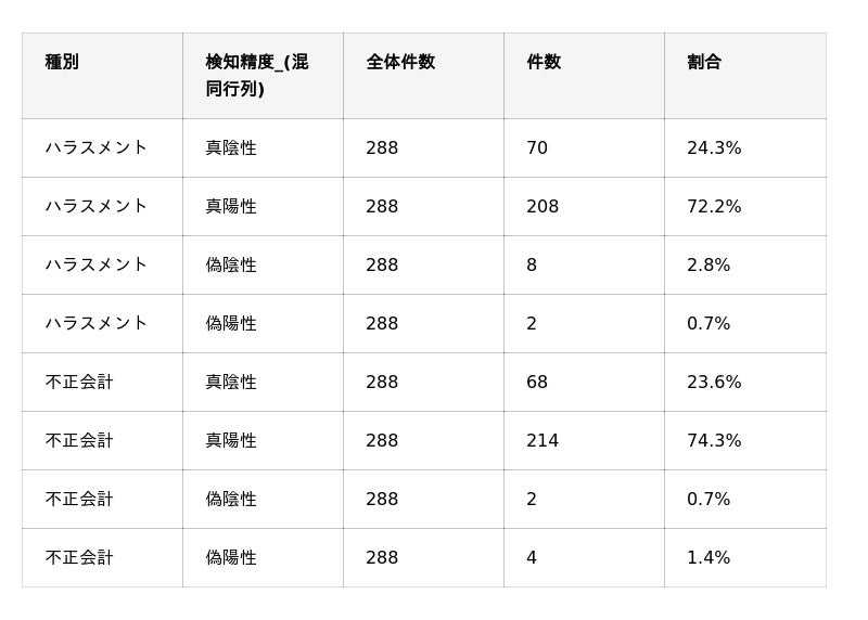 これは、AIによる誤検知が極めて少ないことを示しており、監査担当者は「AIが検知した通知」のみを確認すればよいという、実務運用における高い効率性と信頼性が実証されました。
