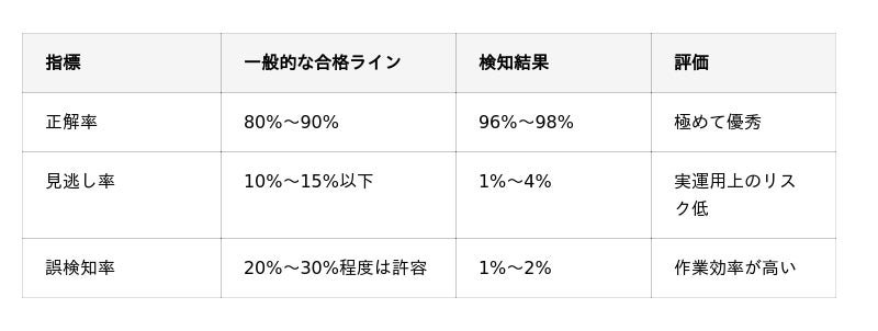 また、今回の検証結果は一般的なAIモデルの合格ラインを大幅に上回っており、実用性が高いといえます。
