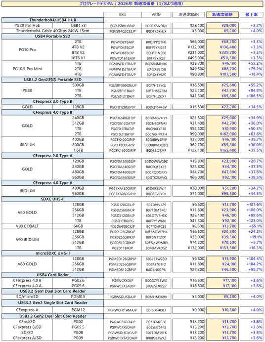 ProGrade Digital Inc.は、AIインフラ構築に伴う半導体メモリーの需要急増によって、フラッシュメモリー価格も大幅に増加していることから、2026年1月8日に、Amazon.co.jp ProGrade Digital Inc.ストアの通常価格を値上げします。同時に、現在$1=150円で適用している為替レートを、現状に合わせ$1=155円に変更します。新通常価格につきましては価格表を参照ください。