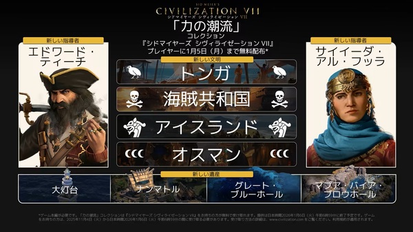 「力の潮流」コレクションは、すでに本編を持っている人向けの拡張ダウンロードコンテンツ。2人の指導者と4つの新文明が追加される内容で、2026年1月5日23時59分までの期間限定で無料配布中だ。