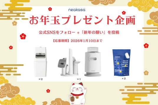 Neakasa 公式 SNS では、新年を記念した「お年玉プレゼント企画」を実施しております。公式アカウントをフォローのうえ、「新年の願い」を投稿いただいた方の中から、抽選で Neakasa 製品をプレゼントいたします。