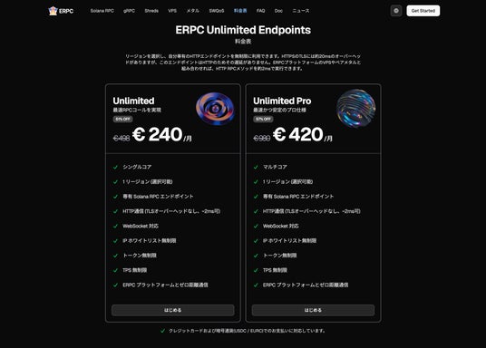 さらに、Unlimited エンドポイントを利用することで、TPS 制限なく、TLS(HTTPS)による約 20ms のオーバーヘッドを排除した HTTP / WebSocket RPC を利用できます。ERPC プラットフォーム上の VPS と組み合わせることで、基本的な Solana RPC メソッドを 2ms で実行可能な構成が成立します。