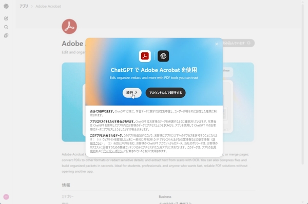 ChatGPTからAcrobatの機能にアクセスできると、画面を移動しないで対応できるのでとても便利。無料アカウントであれば、高度な機能を使えることも大きなメリットになるだろう。今のところ、日本語の扱いが少々弱いが、なる早のアップデートを期待したい。