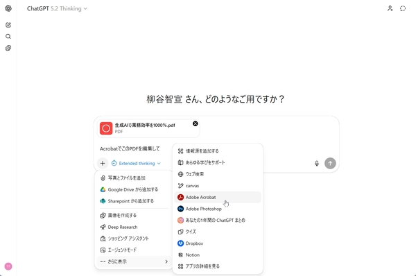 昨年の12月10日、OpenAIとAdobeは「Adobe Apps for ChatGPT」をリリースした。ChatGPTのチャットUI内から、PhotoshopやAdobe Express、Adobe Acrobatの機能に直接アクセスできるようになる。今回は、ChatGPTからAcrobatでどんなことができるのかを試してみた。
