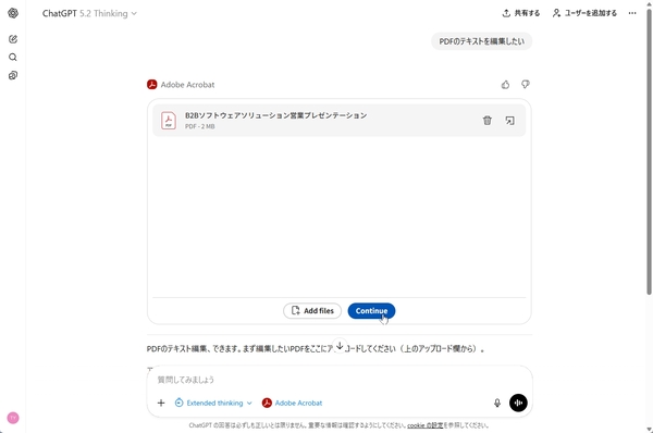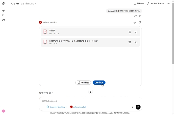 今度は複数ファイルを統合させてみよう。ここでは、営業資料に料金表を追加してみる。まずは、Acrobatモードにして、「複数のPDFを統合させたい」と入力する。複数ファイルをドラッグ&ドロップしてアップロードしたら、確認画面で「continue」をクリックすればいい。