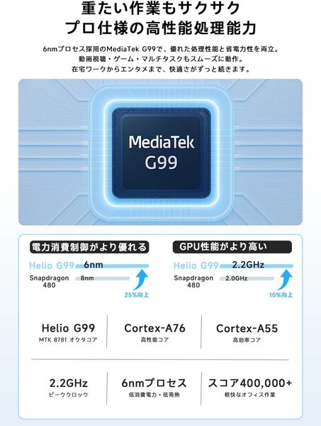 90Hzの高リフレッシュレートにより、滑らかで快適な操作性を実現。一般的な60Hzと比べて、スクロールや画面切り替えがよりスムーズに。さらに、目の負担も軽減されるため、長時間の使用でも安心。学習用タブレット、ビジネスタブレットなど高性能タブレットを求める方にピッタリです。