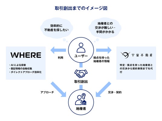 この課題に対処するために、WHEREは不動産仲介免許を持つグループ会社「株式会社宇宙不動産」を新たに設立しました。これにより、「WHERE」で特定・接点を持った地権者との交渉から契約実務までを代行する体制を構築します。