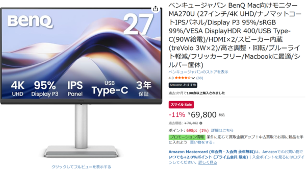「BenQ Mac向けモニター「MA270U」」の過去価格は78,482円ですが、セールでは11%オフの69,800円という割引価格で手に入ります。
