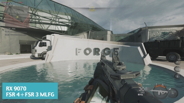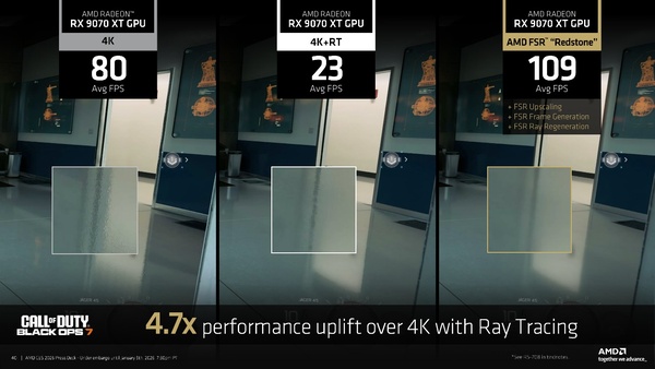 「Call of Duty: Black Ops 7」はFSR RRにいち早く対応したタイトルである。レイトレーシングをつけて4KでレンダリングするとRX 9070 XTでも20fps台にまで落ち込むが、FSR 4+FSR 3 MLFG+FSR RRをフルセットで導入すると、109fpsまで上昇。これはレイトレーシングなしの時よりも軽快、かつ細部の描写精度も向上すると謳っている
