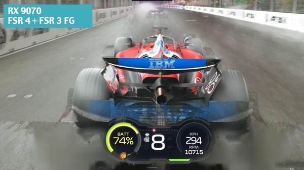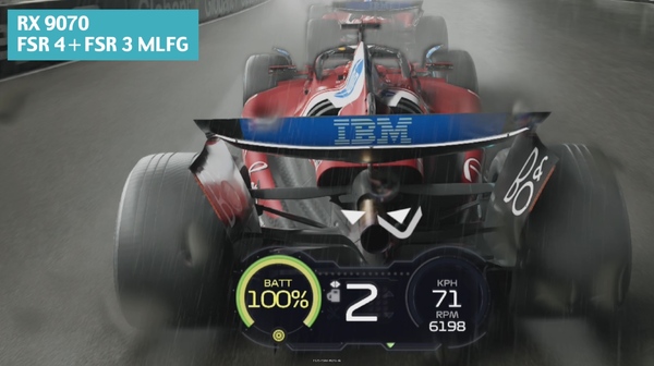 F1 25をRX 9070、画質「超最大」つまりパストレーシングありで実行した際の画面。高速で走行する車体の周囲にFSR 3 FG特有のゴーストが出ている。特にウイングの青い残像が車体の下部に滲みでている点に注目。Optical Flowの処理が不完全なため、本来は出ないはずの残像がフレーム生成時に出現しているのだ
