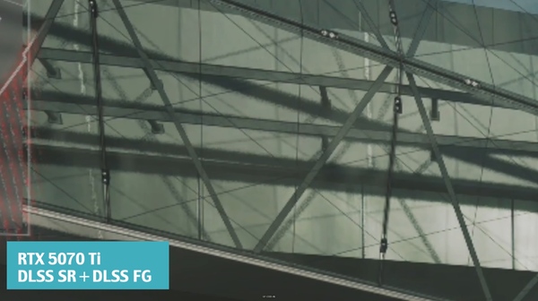 同じシーンをFSR 3 MLFGで描画したところ。ゴーストの類は完全に消え、チラつきのない非常に安定した描写となった。FSR 3 MLFGは高速で移動する物体(というよりモーションベクターの大きな領域を含んだシーン)の描写に強い