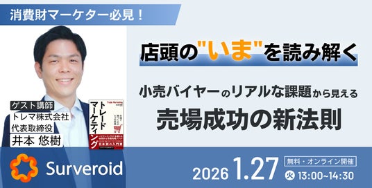 セルフ型アンケートツール「Surveroid(サーベロイド)」を提供する株式会社マーケティングアプリケーションズ(以下、「マーケティングアプリケーションズ」)(本社:東京都渋谷区、代表取締役:竹中 司)は、トレマ株式会社の井本祐樹氏をゲスト講師としてお招きし、無料ウェビナー「消費財マーケター必見!「店頭の"いま"を読み解く」~小売バイヤーのリアルな課題から見える、売場成功の新法則~を2026年1月27日(火)13時に開催します。