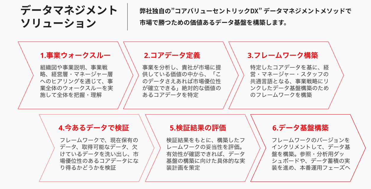 - 確立されたコンサルティングによるコアデータの特定から、フレームワークの構築、データ基盤の構築まで、段階的なメソッドで確実な成果を実現