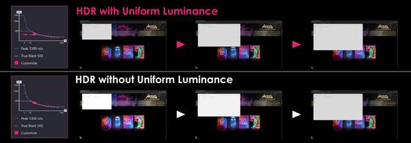 新ラインアップのコア技術には、MSI独自開発のDarkArmorとUniform Luminanceがある。DarkArmor Filmは、光吸収効果を高め、色の不自然な偏りを是正し、黒レベルやコントラストを向上させるという。また、画面の硬度を強化し、耐傷性を高めるため、日常の摩耗や損傷からもしっかり保護する。一方、Uniform LuminanceはHDRの輝度カーブをカスタマイズよう工夫されており、使用シナリオごとの輝度の安定とスムーズな表示を可能にする。