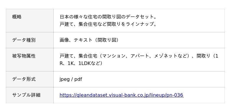 Visual Bank株式会社(東京都港区、代表取締役CEO 永井真之、以下「Visual Bank」)は、傘下の株式会社アマナイメージズを通じて展開するAI学習用データソリューション『Qlean Dataset(キュリンデータセット)』において、『日本の様々な住宅の間取り図データセット』の提供を開始しました。