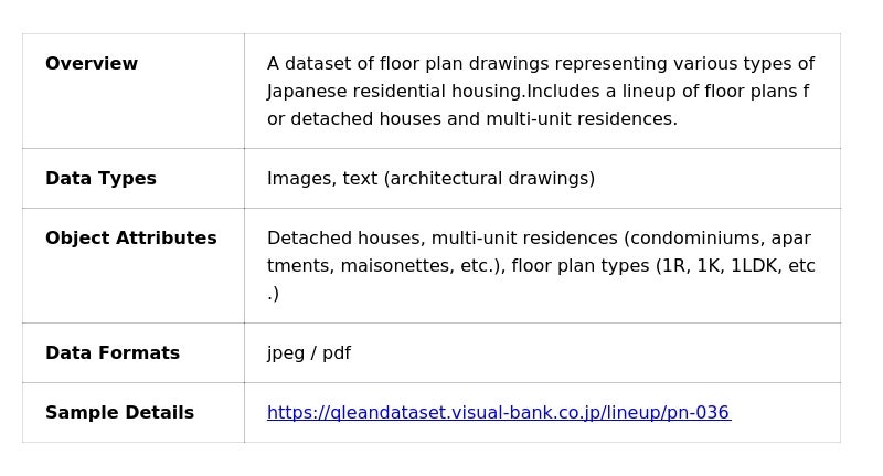 This dataset is provided as part of Qlean Dataset’s machine learning dataset lineup, AI Data Recipe, and consists of floor plan drawings of residential properties in Japan. It is designed for research and development of AI systems that require spatial understanding in the fields of architecture, housing, and real estate.
